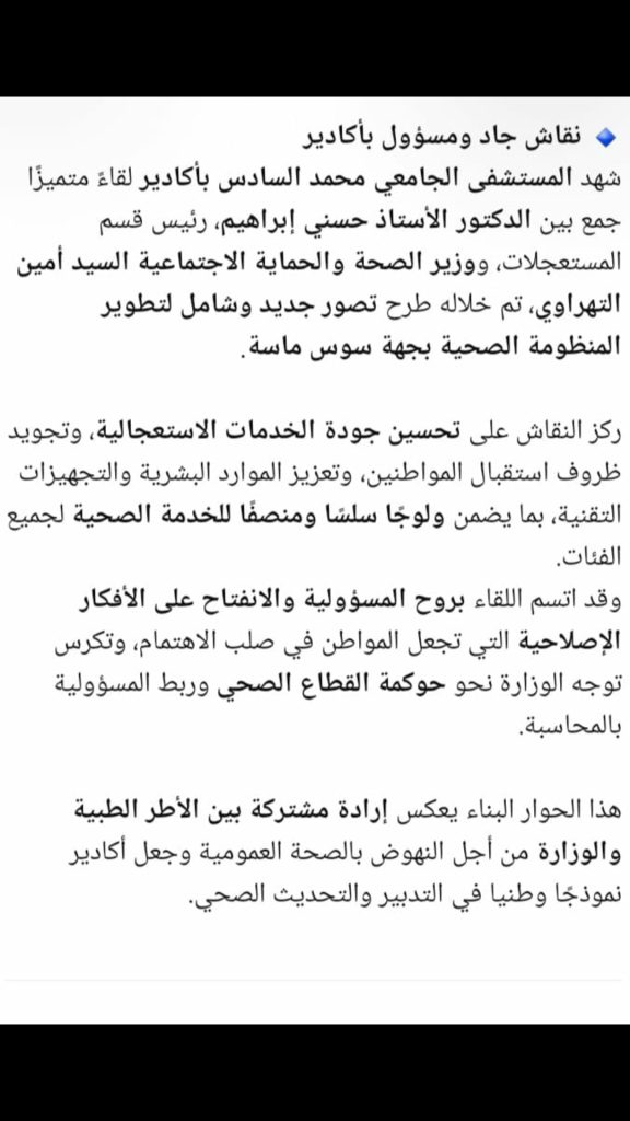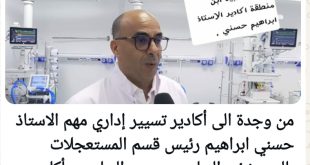 الاستاذ حسني ابراهيم رئيس قسم المستعجلات بالمستشفى الجامعي محمد السادس بأكادير بكل مسؤولية . مقالات مشابهة صور من المستشفى الجامعي محمد السادس بأكادير. 9 نوفمبر، 2025 الجرف الأخضر يحتفل بالذكرى الخمسين للمسيرة الخضراء في أجواء وطنية مميزة 9 نوفمبر، 2025 وزير الداخلية ينصب امحمد العطفاوي واليا على جهة الشرق 9 نوفمبر، 2025