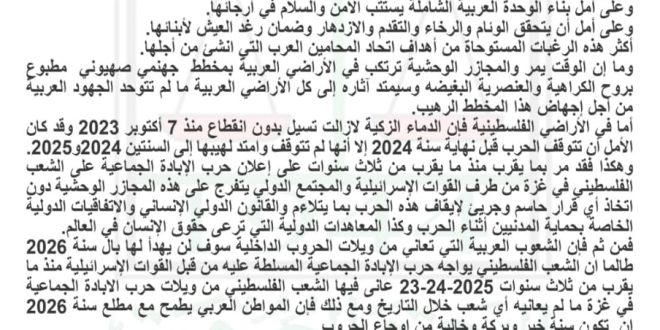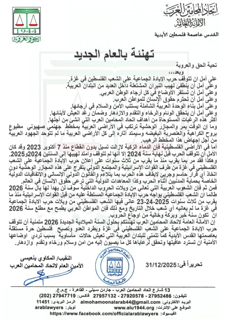 الامين العام لاتحاد المحامين العرب المكاوي بنعيسى….يهنئ …ويواصل …. مقالات مشابهة صورة 2026 السنة بعين على فلسطين 1 يناير، 2026 رسالة الشرق تبارك حفل عائلة لزرك بوجدة 7 ديسمبر، 2025 عقد قران الدكتورة منال الرابحي ابنة اخينا عبد العزيز الرابحي يوم الحدث :15غشت 2025 29 يوليو، 2025