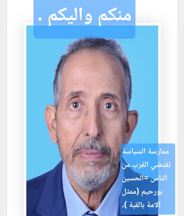 حين تقترب من الناس رب الناس يذهب البأس الاجتماعي الحسين بورحيم نائب برلماني عن الدائرة الانتخابية تارودانت الشمالية ورئيس جماعة تنزرت عن حزب الأصالة والمعاصرة.