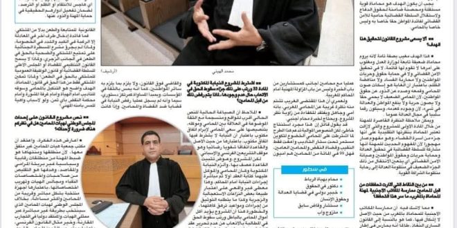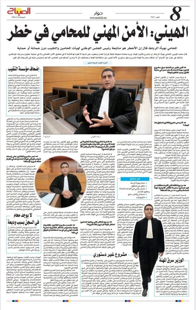 صرح المحامي والقاضي السابق محمد الهيني بأن الأمن المهني للمحامي في خطر. وأضاف في حوار مع جريدة الصباح: إن مشروع قانون المهنة يروم مصادرة وظيفة الدفاع، ويضرب مبدأ استقلالية المحامي، ويؤدي إلى عسكرة المهنة، ولا يقدم أي إضافة في تحقيق الأمن القضائي، ولا يوفر حماية لحقوق وحريات المواطنين، مضيفًا أن النص المقترح يمس جوهر المهنة ويشكل تراجعًا خطيرًا عن المكتسبات الدستورية.وأوضح الهيني أن ما يقع اليوم هو استهداف مباشر للمحاماة عبر نصوص تشريعية لا تحترم طبيعة المهنة ولا دورها في حماية الحقوق والحريات، معتبرا أن أي إصلاح حقيقي يجب أن يتم بتشاور فعلي مع الهيئات المهنية، وليس بفرض منطق الوصاية.