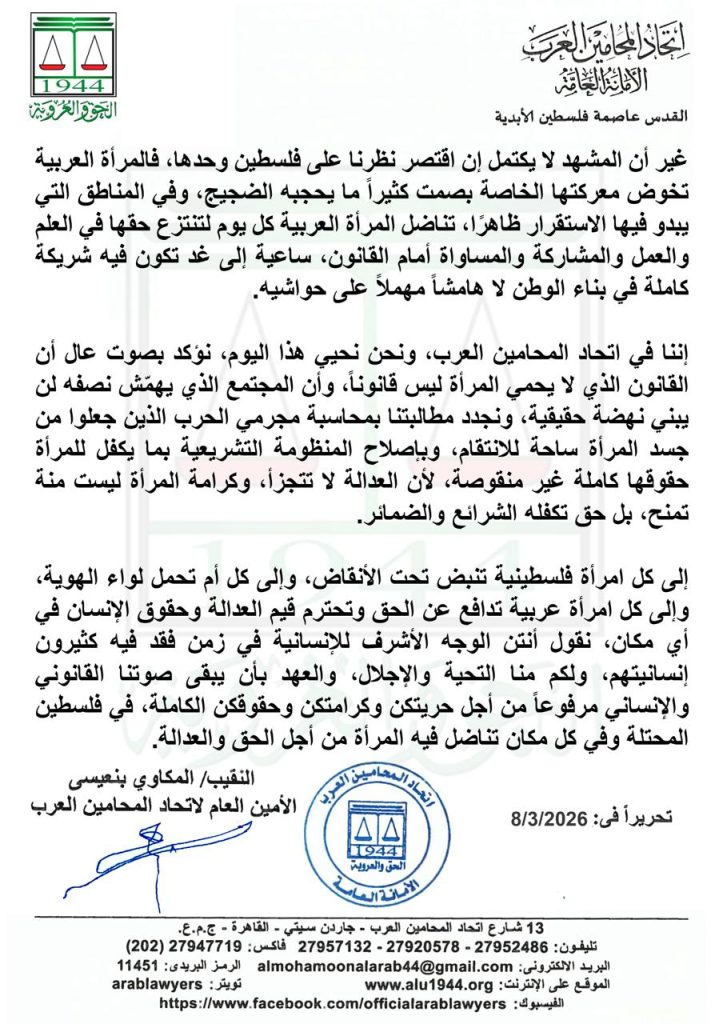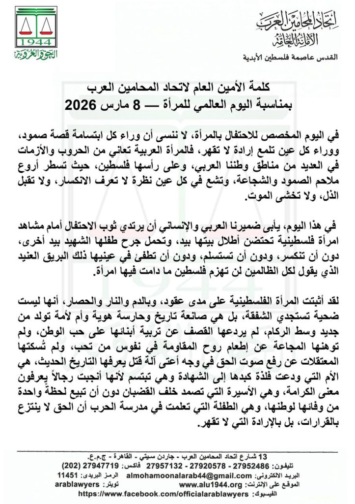 المراة الفلسطينية حاضرة في كلمة رئيس اتحاد المحامين العرب المغربي المكاوي بنعيسى