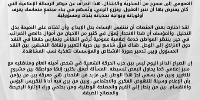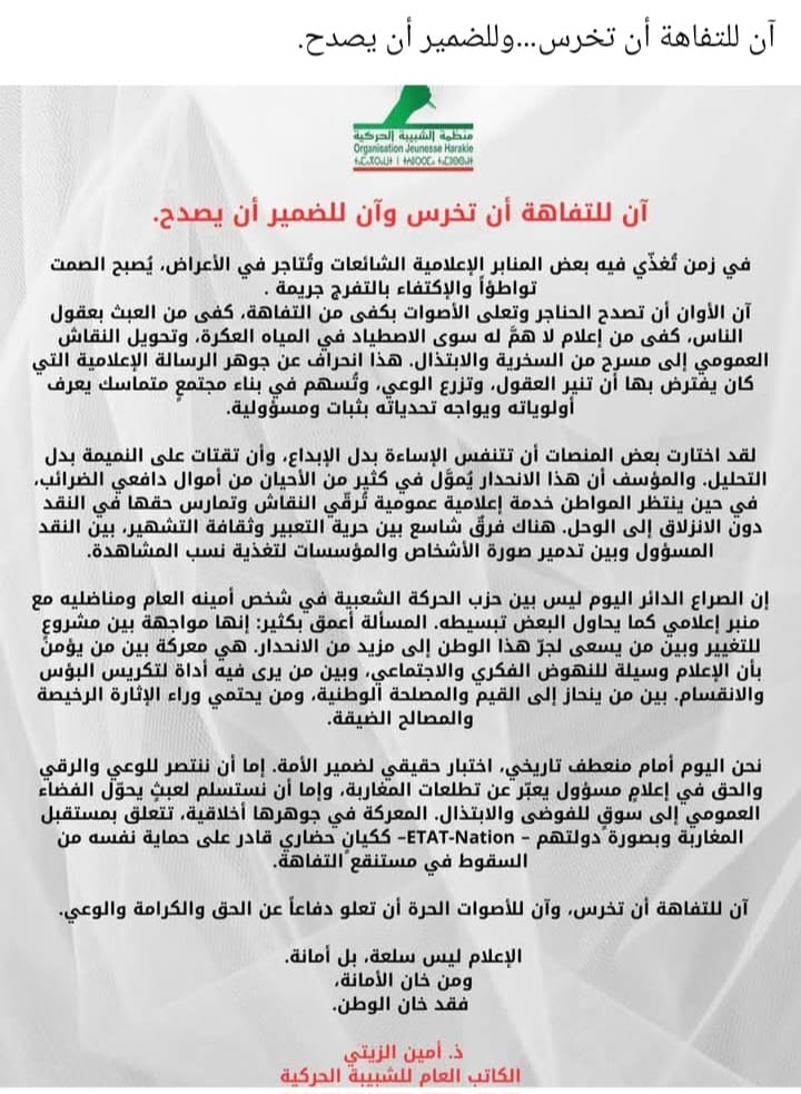 بيان.. ولكم واسع النظر مقالات مشابهة الاعلام ببركان مهدد ؟ 18 ديسمبر، 2025 انتقادات برلمانية لاختلالات في توزيع الدعم على المقاولات الإعلامية 17 ديسمبر، 2025 يونس مجاهد ينفي بشكل قاطع وجود أي استهداف أو تآمر ضد الصحافي حميد المهدوي 10 ديسمبر، 2025