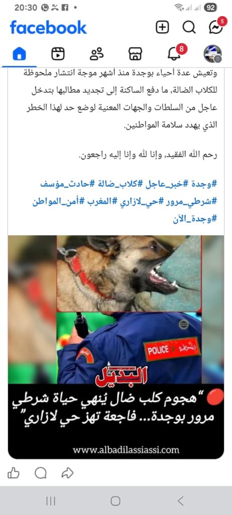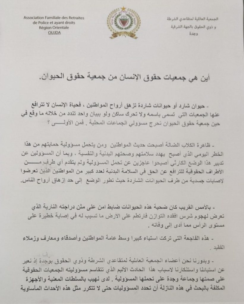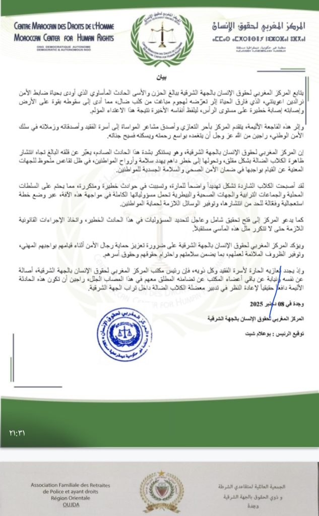 تنديدات اعلامية وجمعوية لمقتل الشرطي بسبب عضة كلب . مقالات مشابهة رسائل إلى المعنيين: وفاة شرطي، وباقيين في كراسيكم؟ 8 ديسمبر، 2025 إيقاف تنفيذ قرار مجلس جامعة محمد الأول القاضي بفرض رسوم مالية على طلبة الدكتوراه الموظفين 7 ديسمبر، 2025 المحكمة الإدارية بوجدة توقف رسوم التسجيل في الدكتوراه 5 ديسمبر، 2025