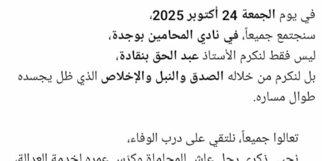 رسالة من الأمين العام لاتحاد المحامين العرب الاستاذ المكاوي بنعيسى. مقالات مشابهة النقيب المكاوي بنعيسى الامين العام لاتحاد المحامين العرب ابن منطقة كبدانة يرسل رسالة الى الاستاذ عبد ااحق بنقادى المشارك بأسطول الصمود نحو غزة. 14 أكتوبر، 2025 إسرائيل تُفشل إطلاق مروان البرغوثي في اللحظة الأخيرة.. مناورة نتنياهو التي تهدد اتفاق التبادل 11 أكتوبر، 2025 إسرائيل تصدر بطاقات ترحيل غالي وابن ضراوي.. واسماهما غير مدرجين على قائمة الأحد 6 أكتوبر، 2025