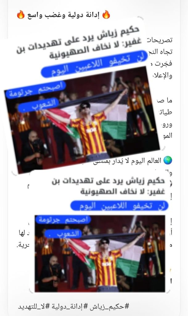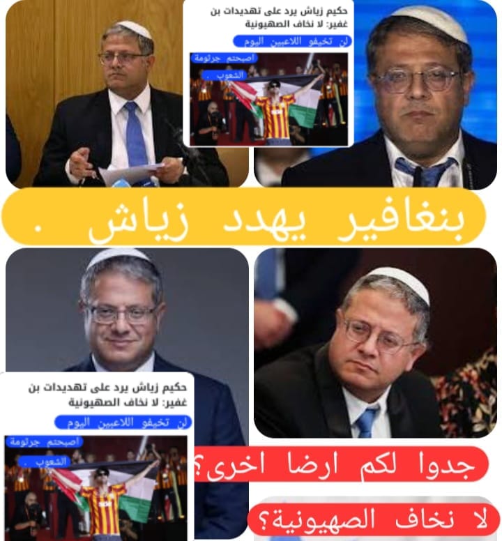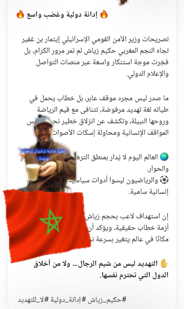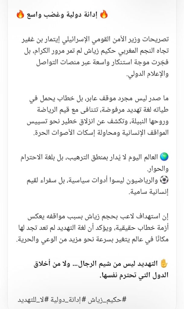 ادانة عالمية ضد وزير الامن القومي الاسرائيلي بن غفير تهديدك للاعب اامغربي زياش خطوة اخرى في طريق محو الصهيونية من سياسات العالم لغة التهديد ليس من شيم الرجال؟