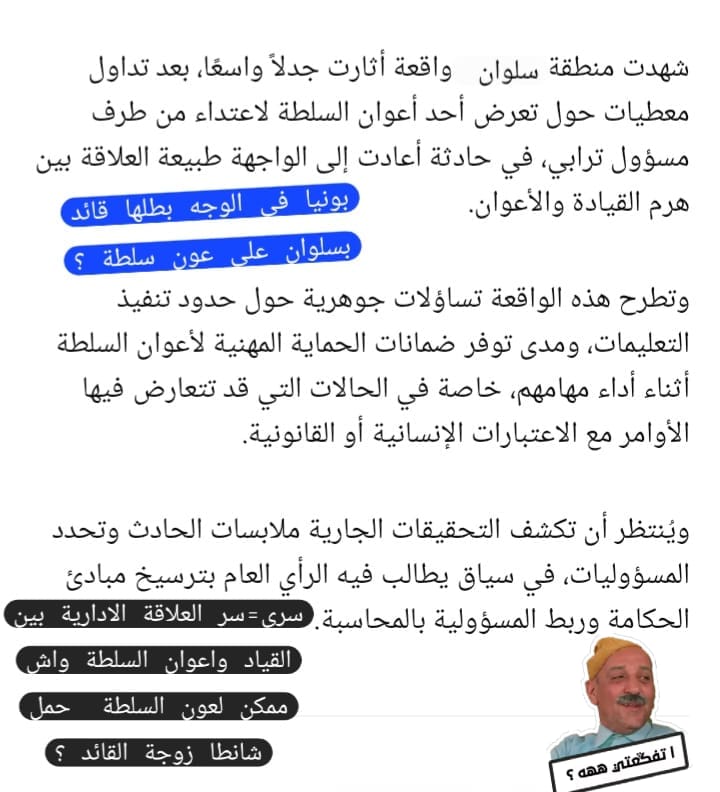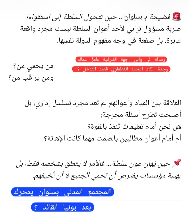 مسؤول ترابي بسلوان في اواخر رمضان ضربة قائد لعون سلطة وجعلته طريحا ونقل اثرها الى المستعجلات والمجتمع المدني يتدخل بسلوان ومطالب بتدخل عامل اقليم الناظور جمال الشعراني؟ مقالات مشابهة نقيب هيئة المحامين بوجدة ببركان ها علاش 17 مارس، 2026 حديث الصورةنقيب هيئة المحامين بوجدة ببركان 15 مارس، 2026 العثور على أربع جثث لمهاجرين أفارقة بضواحي فكيك بوعرفة 14 مارس، 2026