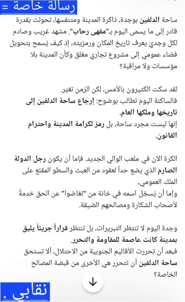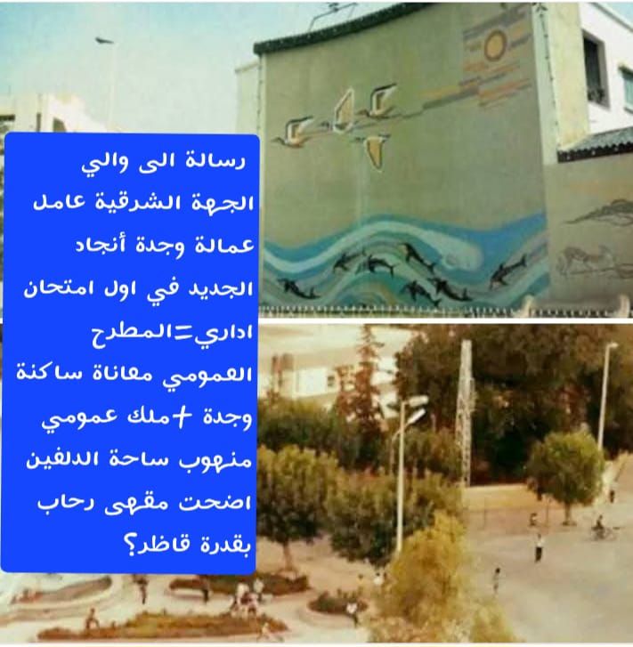 والي الجهة الشرقية عامل عمالة وجدة أنجاد الجديد امحمد العطفاوي امام امتحان اما يتبع نهج وزير الداخلية او يوالي اصحاب الشكارة بوجدة =ارجاع ساحة الدلفين إلى تاريخها وارثها بوجدة حيث اضحت مقهى رحاب بقدرة قادر ودهشة لوجادة ولكن جاء التحرير بعد تحرير الأقاليم الجنوبيةهل ستتحرر ساحة الدلفين بوجدة؟