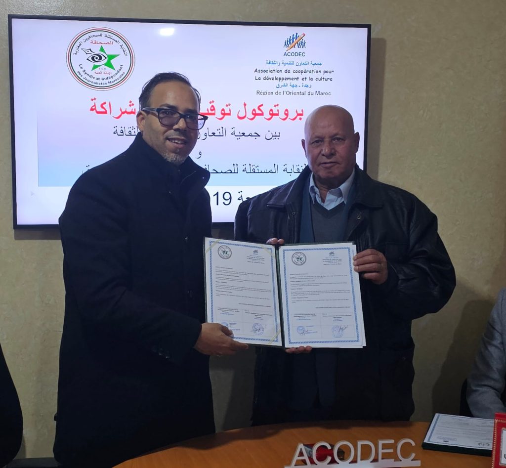 احتضن مقر جمعية التعاون من أجل التنمية والثقافة (ACODEC) بمدينة وجدة، يوم 19 يوليوز 2025، لقاءً تواصليًا هامًا تُوّج بتوقيع اتفاقية شراكة وتعاون بين الجمعية والنقابة المستقلة للصحافيين المغاربة بجهة الشرق، في خطوة ترمي إلى تعزيز العمل المشترك في مجالات الإعلام، الهجرة، وحقوق الإنسان.